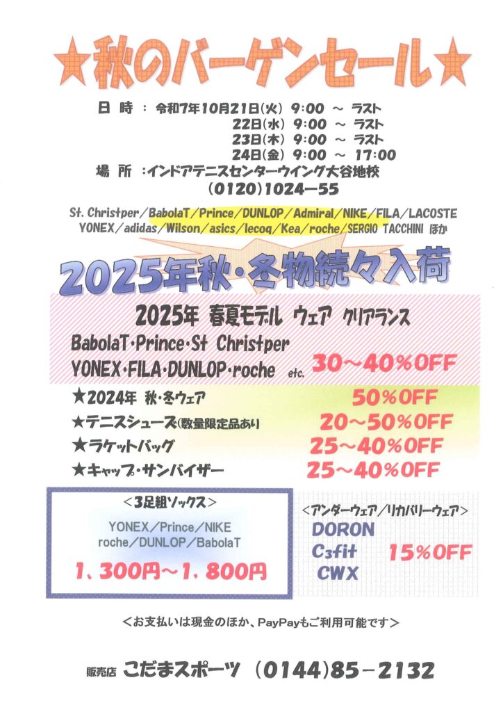 10/21(火)から4日間、こだまスポーツバーゲンを開催します!秋冬の新作も入荷しているようです。ぜひお気に入りのアイテムを見つけて下さいね♪